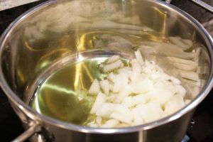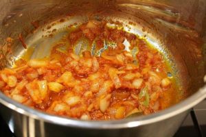 - Heat 2 tablespoons of olive oil in a deep sauté pan over medium heat. When the oil is hot, add the bay leaves, ground ginger and onions and sauté until the onions become soft, about 4-5 minutes.