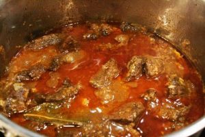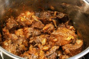 Sri Lankan Black Pork Curry gets its name from the ground black pepper used in the marinade. It is a dish made with tamarind, and I used a Moroccan spice blend so it’s not 100% Sri Lankan but tasty just the same. I also added some ingredients to lift the color a bit. The flavor hasn’t changed, it has a wonderful tart and peppery flavor. A really nice Sunday evening meal, try it with some plain boiled potatoes or white rice.