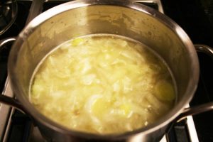 - Peel and cut 1 whole potato in cubes and add the potato, add 1 1/2 cups chicken stock and simmer until potato is soft, about 15-20 minutes.