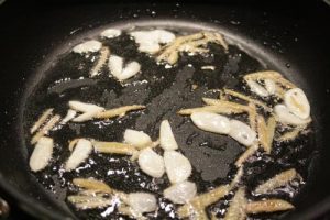 - Heat oil in a medium skillet over medium high heat for 1 minute and add julienned ginger and sliced garlic, stir to combine, cook for 1-2 minutes.