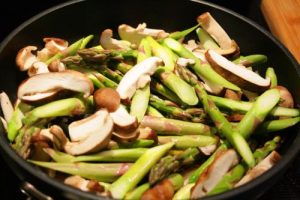- Add sliced mushrooms and asparagus and stir to combine, 2-3 minutes.