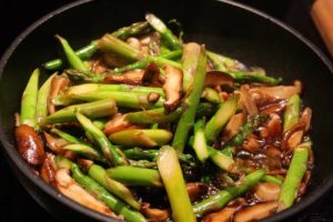 This Stir Fried Asparagus and Mushroom recipe is a simple vegetable and vegetarian dish. Easy to make with fresh seasonal vegetables, or just as I have shown. You can make this in any quantity, so it is good for one to twenty one, and it’s calorie friendly.