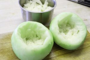 - Peel 3 kohlrabi, then scoop out the flesh from two, leaving the outer flesh and bottom intact. Peel and chop the remaining and combine with the scooped-out portion of the kohlrabi and set aside until ready to make the sauce.