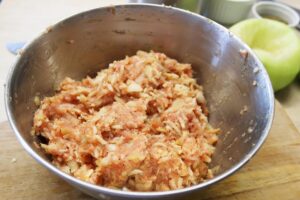 - Mix the cooked rice with 1/2 lb ground pork, 1/2 medium onion, 1 whole egg, kosher salt and 1 tsp finely ground black pepper. Mix with your hands to combine. Set aside until ready to use.