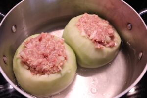 - Stuff the hollowed-out kohlrabi with the meat mixture and place the vegetables in a deep sauté pan. Add enough water to come up the side of the vegetables, but not to cover, and bring to a boil. Turn the heat down to a simmer, cover and cook until the kohlrabi is soft, about 20-30 minutes. Reserve the cooking liquid and remove stuffed kohlrabi to a plate and reserve.Make mini meatballs with any leftover stuffing mixture and reserve.
