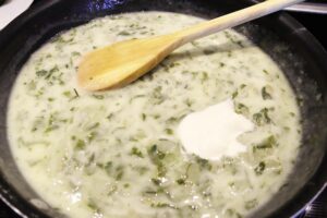 - Add 1/2 cup crème fraîche or rich sour cream. If using sour cream, add just before serving and remove the pan from heat before adding. If using crème fraîche add once the sauce has thickened and keep warm until ready to serve.