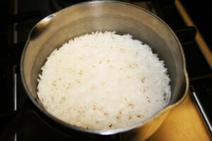 - Add 1/3 cup uncooked rice to a small sauce pan, barely cover with water and bring to a boil, reduce to a fast simmer and cook until all the water has been absorbed, about 5 minutes. Set aside to cool.