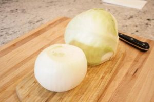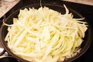 - Heat 1 tbsp olive oil in large skillet over medium heat and add onions. Sauté until the onion becomes soft then add the sliced cabbage and season with kosher salt to taste. Toss to combine. Cover with a lid and sauté over medium heat until the cabbage is reduced in volume by half, about 20 minutes. Turn the cabbage with tongs a few times while cooking to make sure that the cabbage cooks evenly.