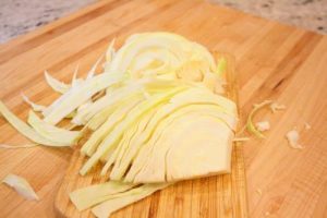 - Remove the core from 1/2 head small white cabbage and slice thinly.