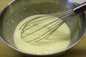 - Combine egg, milk, cream, grated cheese, cornmeal, baking powder and kosher salt and black pepper. Whisk to combine.