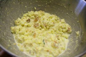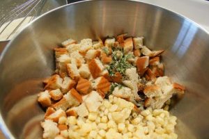 - Transfer cubed bread to a large mixing bowl, add corn and the herbs. Season with kosher salt,