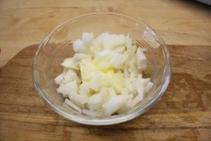 - Combine 2 tablespoons of butter and 1/3 of an onion, finely diced, to a microwave safe dish. Cover with cling wrap and heat on high for 90 seconds.