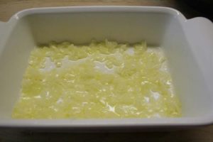 - Spread softened onions and butter on the bottom of a 4" x 8" baking pan and spread evenly along the bottom. Spray the side of the pan with vegetable spray.