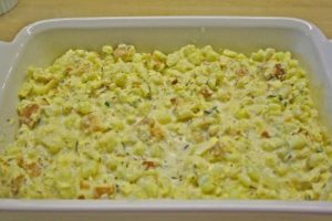 - Spread pudding mixture on top of the onions and spread to the sides.
