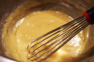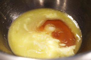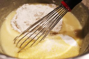 - Add dry mixture to the egg and buttermilk mixture and stir to combine.