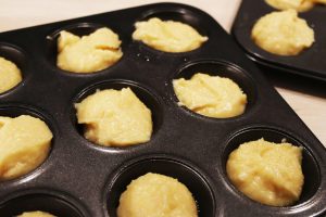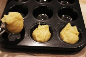 - Using a scoop, drop dough into prepared muffin tins and allow to rest for 3 minutes before placing in oven.