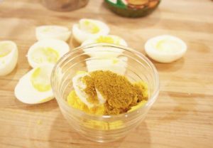 - Slice Eggs in half, remove yolks to a small bowl. Combine egg yolks with curry powder, relish, salad dressing and season with salt and pepper. Using a fork, break up the yolks and combine with the rest of the ingredients.