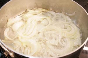 - Add 1/2 medium yellow onion, finely sliced to the oil and fry the onions until they are soft, 2-3 minutes.