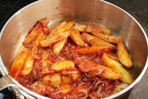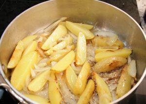 - Add 1 medium white potato cut into wedges to the onions and cover and cook over medium high heat for about 10 minutes, or until the onions have started to color and the potatoes have begun to soften.
