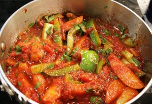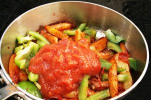 - Add the 1/2 green bell pepper cut into 2-3 slices. Cook for 5-6 minutes or until the peppers begin to soften. Then add 1/2 can chopped tomatoes and juice, 2-3 sprigs fresh cilantro, chopped, and then blend in 1/2 cup water and simmer for about 10 minutes, covered.