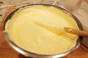 - Transfer mixture to a metal mixing bowl and chill in an ice bath, stirring frequently, until the mixture has thickened to a consistency of lightly beaten eggs whites.
