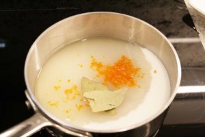 - Stir in lemon juice, a pinch of salt, and remove from heat, remove zest and bay leaves and allow to cool.