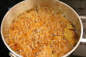 - Combine sugar, water, bay leaves and zest in small sauce pan and bring to a boil, stirring until sugar has dissolved and turns amber, about 7-8 minutes.