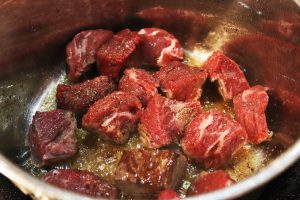 - Transfer seasoned beef to the pot with the bacon drippings, increase heat to medium high. Do not crowd beef, sear only as many pieces at a time as you can fit in one layer. Sear each side until browned, about 2-3 minutes per side.