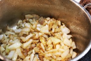 - Add 1 medium onion, chopped to the fat remaining in the pan and stir to combine. Cook until the onions begin to brown.