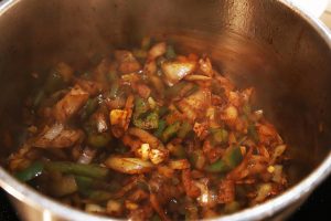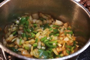 - Add 1 whole green bell pepper diced and 3 cloves garlic, finely chopped and cook until the garlic is frangrant about 1 minute.