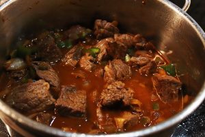 - Return seared beef to the pan, stir to combine with onions and spices and add 4 cups beef broth, or just enough to barely cover and add 1 14 oz can, crushed tomatoes. Stir to combine, bring to a boil, then turn down heat to a simmer and cook for 2-3 hours, or until the beef is very tender.