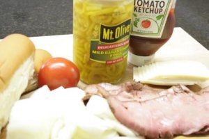 - Place sauteéd onions on bottom, top with beef and cheese, sliced peppers, and add ketchup if you like.