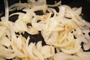 - Heat oil in a medium skillet over medium high heat and add sliced onion, sauté until the onion starts to caramelize, about 4-5 minutes