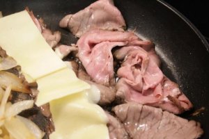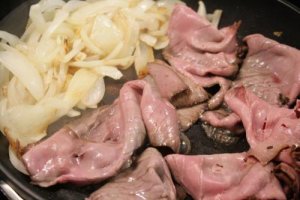 - Move onions to one side of skillet and add two rows of 4 slices of roast beef each in the space remaining, sauté for 1-2 minutes.