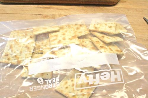 - Put 20 Saltine crackers in a reseal able plastic bad and crumble using a rolling pin.
