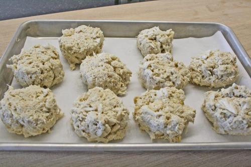 - Using a 1/3 cup measure, make crab cakes and place on a cookie sheet.