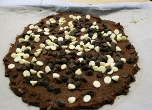 - Sprinkle with white and semi sweet chips on the cookie dough, and gently press into dough.