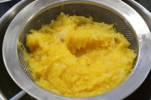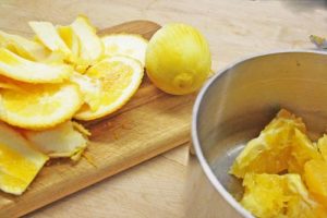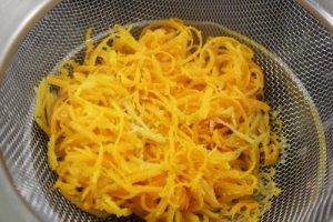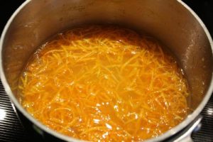- Strain water from zest, cover with water again and simmer for 10 minutes.