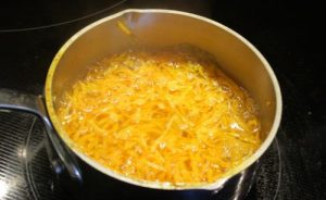 - Put zest in a small sauce pan and barely cover with 1 cup water, bring to a boil.