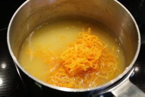 - Add zest to sugar and liquid, bring to a boil, then reduce heat and simmer for 15 minutes.