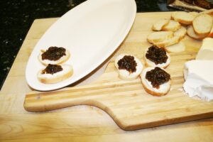 - Spread 1/3 of the slices with cream cheese and drop a spoonful of bacon marmalade on each slice