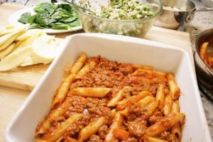 - Add about 1/3 of the meat/pasta mixture on the bottom of the baking dish and flatten the layer.