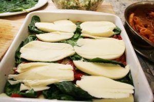 - Add a layer of the cooled cooked lasagna and cover with half of the wilted spinach, half of 2 roasted red bell peppers cut into strips and half of 1 whole mozzarella ball sliced, or grated mozzarella. Drizzle with half of the olive oil and season with kosher salt. Drizzle remaining olive oil over the next layer of lasagna.