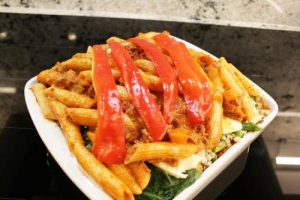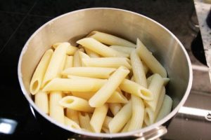- Bring water to a boil in a medium sauce pan, add a generous amount of kosher salt. When the water is boiling, add the pasta (fusili, elbow macaroni or penne) and cook for 10-15 minutes or until al dente. Strain, and mix 2 cups cooked pasta drained, with the meat sauce.