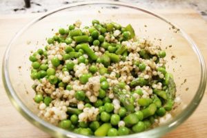 - Combine couscous with 1/2 cup store bought pesto and add the asparagus and 1/2 cup grated Pecorino-Romano or Parmesan cheese.