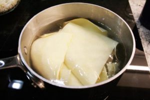 - In the same sauce pan, add water and bring to a boil again, season with kosher salt and add 4 dried pasta sheets, cook for about 10-15 minutes or until al dente, drain, return the lasagna to the sauce pan and cover the pasta with cold water.