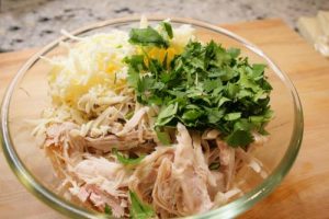 - Add chicken or turkey, Colby cheese and cilantro and mix until thoroughly combined.