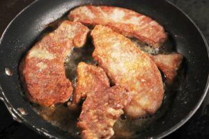 - Heat 2 tbsp canola oil in a medium skillet over high heat, when hot (1-2 minutes) add slices of veal and cook until the veal turns a nice brown, about 3 minutes.