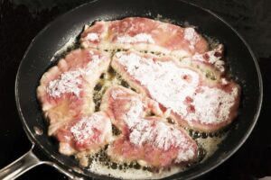 - Spread 1/2 cup all-purpose flour on a sheet of parchment paper and dredge veal, shaking off excess flour.