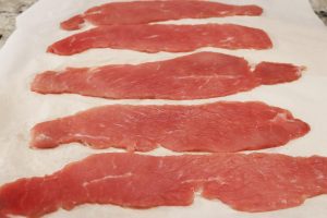 - Place scallopini between 2 sheets of parchment paper, and using the flat side of a meat mallet, gently pound the scallopini. Don't make it paper thin, just enough to make each slice slightly larger.